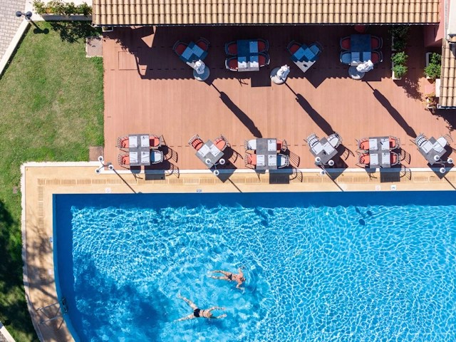 The Valmar Cordu is in Agios Ioannis Melitieon, a 5-minute drive south from Benitses. It’s a 4-star all-inclusive hotel that stands above the road overlooking a beach and the sea, and with wooded hills all around. It’s got two pools, a waterpark, a tennis court, other sporting facilities, organized children’s activities, a mini-market, and many other facilities.
